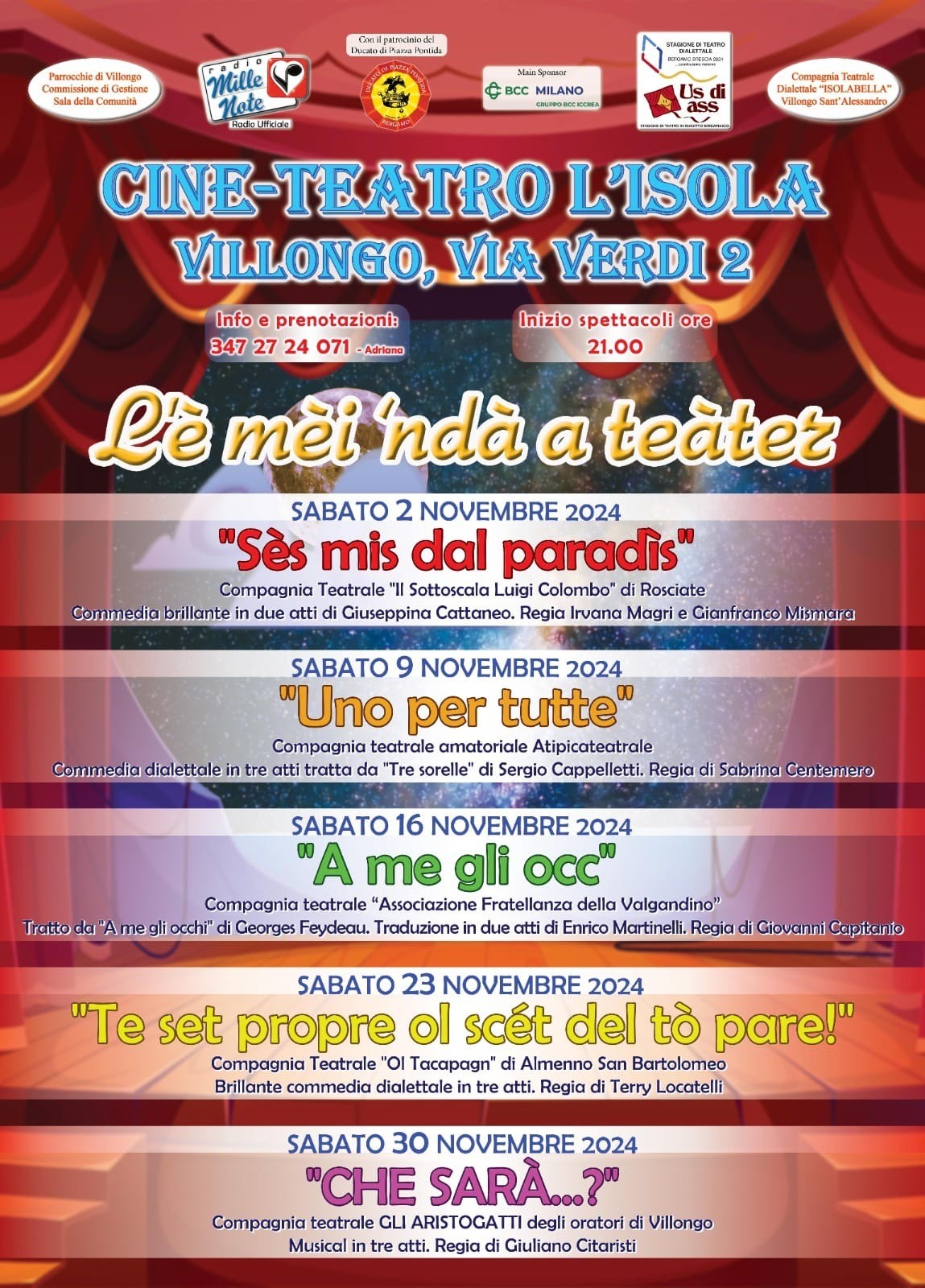 The first event of the “L’è mèi ‘ndà a teàter” review will be held on Saturday November 2nd, 2024 at the Cine-Teatro L’Isola di Villongo.