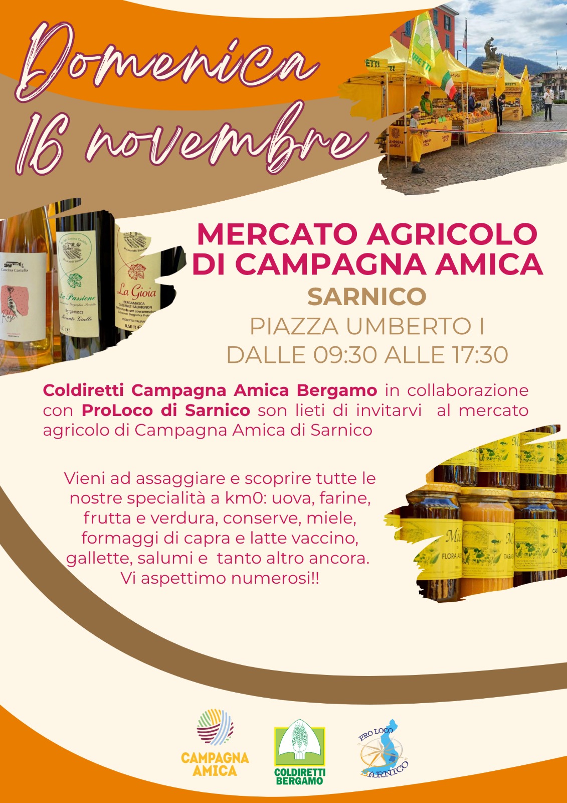On Sunday, November 16th, Coldiretti Bergamo's "Campagna Amica" market will be held in Piazza Umberto I in Sarnico.
