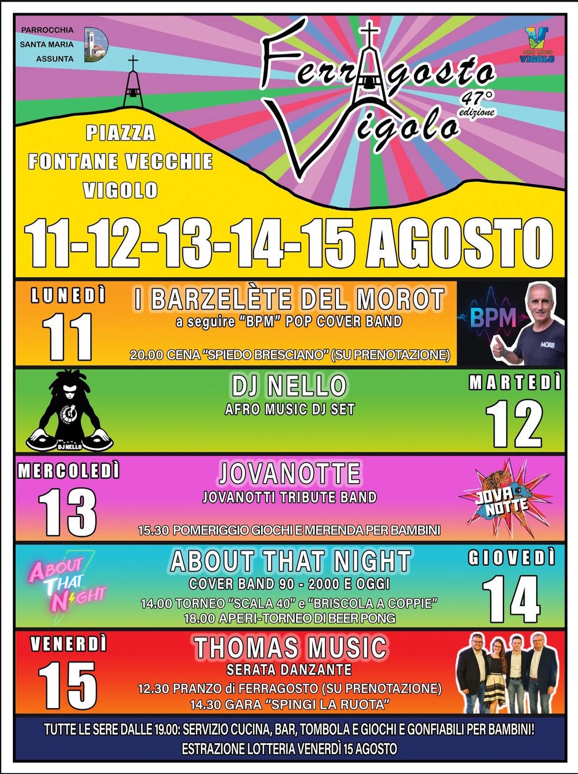 From Monday, August 11th to Friday, August 15th, the 47th edition of “Ferragosto a Vigolo” will be held in Piazza Fontane Vecchie in Vigolo.
