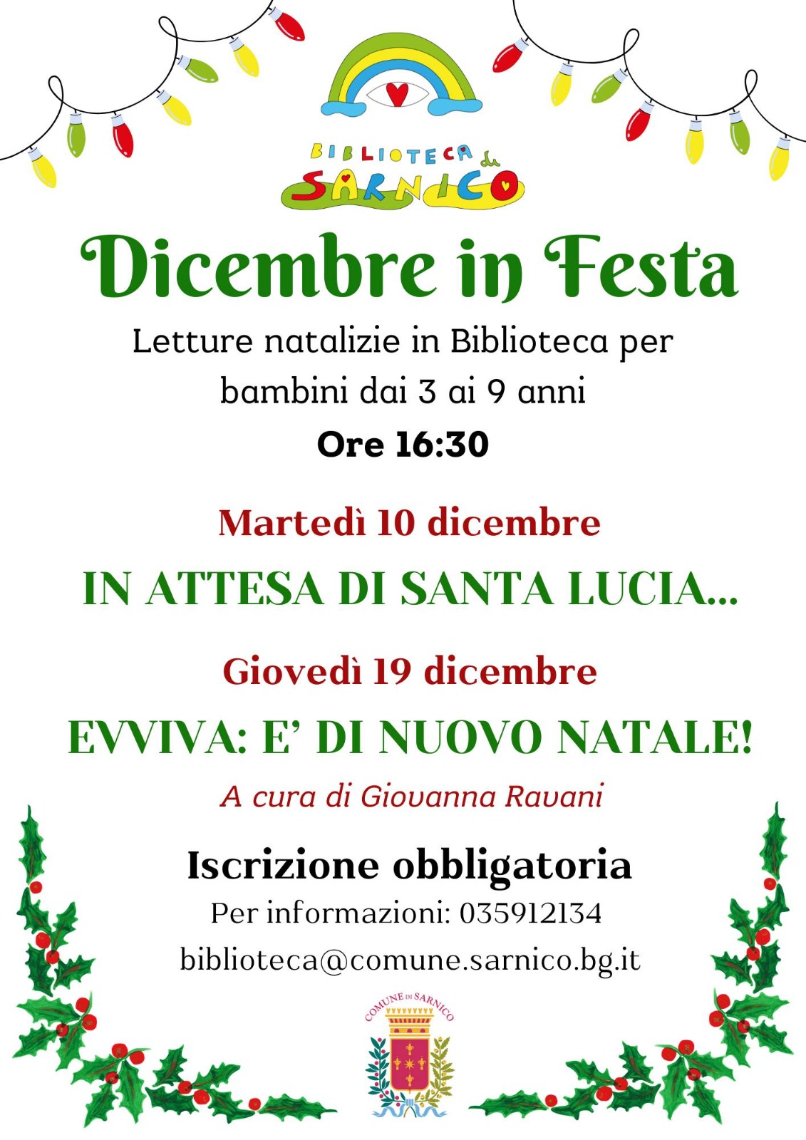 As part of the event “Sarnico Magic Christmas…a Christmas in Color”, Tuesday 10th December 2024, at 4:30 pm, the reading for children ‘Waiting for Santa Lucia…’ will take place at the Sarnico Municipal Library.