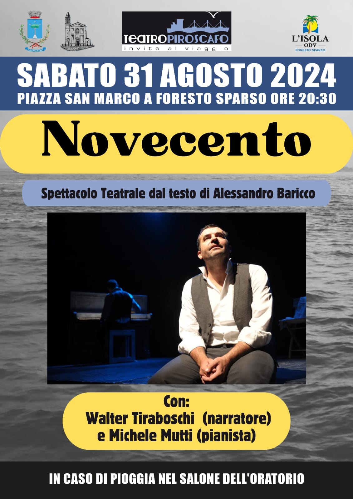 On Saturday 31st August 2024, at 8:30 pm, in Piazza San Marco in Foresto Sparso, there will be “NOVECENTO”, a theatrical show based on the text by Alessandro Baricco.