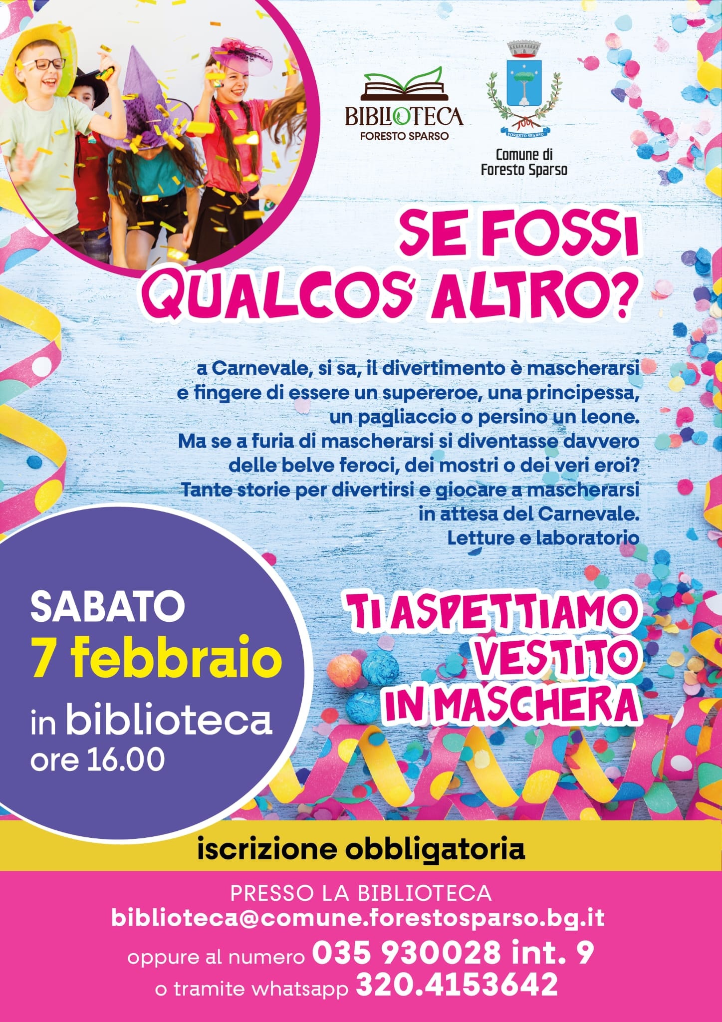 Sabato 7 febbraio, alle ore 16:00, si festeggerà il Carnevale “Se fossi qualcos’altro?” presso la Biblioteca di Foresto Sparso.