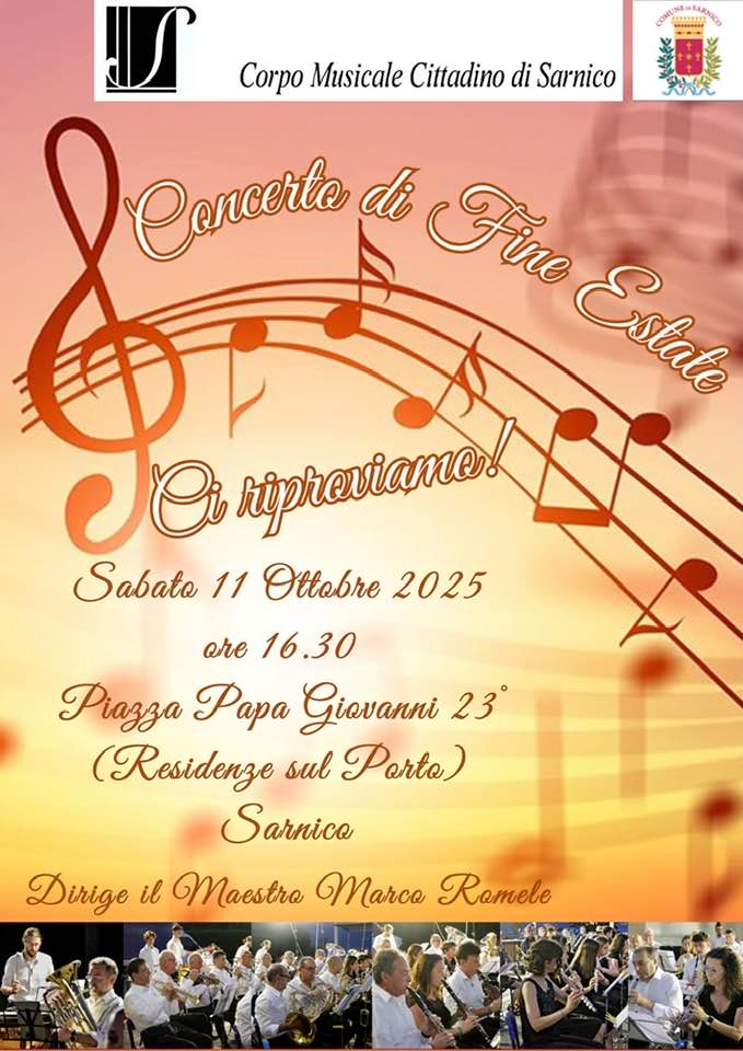 Sabato 11 ottobre, presso la Piazza Giovanni XXIII (Residenze sul Porto) di Sarnico, alle ore 16:30, si terrà il CONCERTO DI FINE ESTATE con il Corpo Musicale “Città di Sarnico”.
