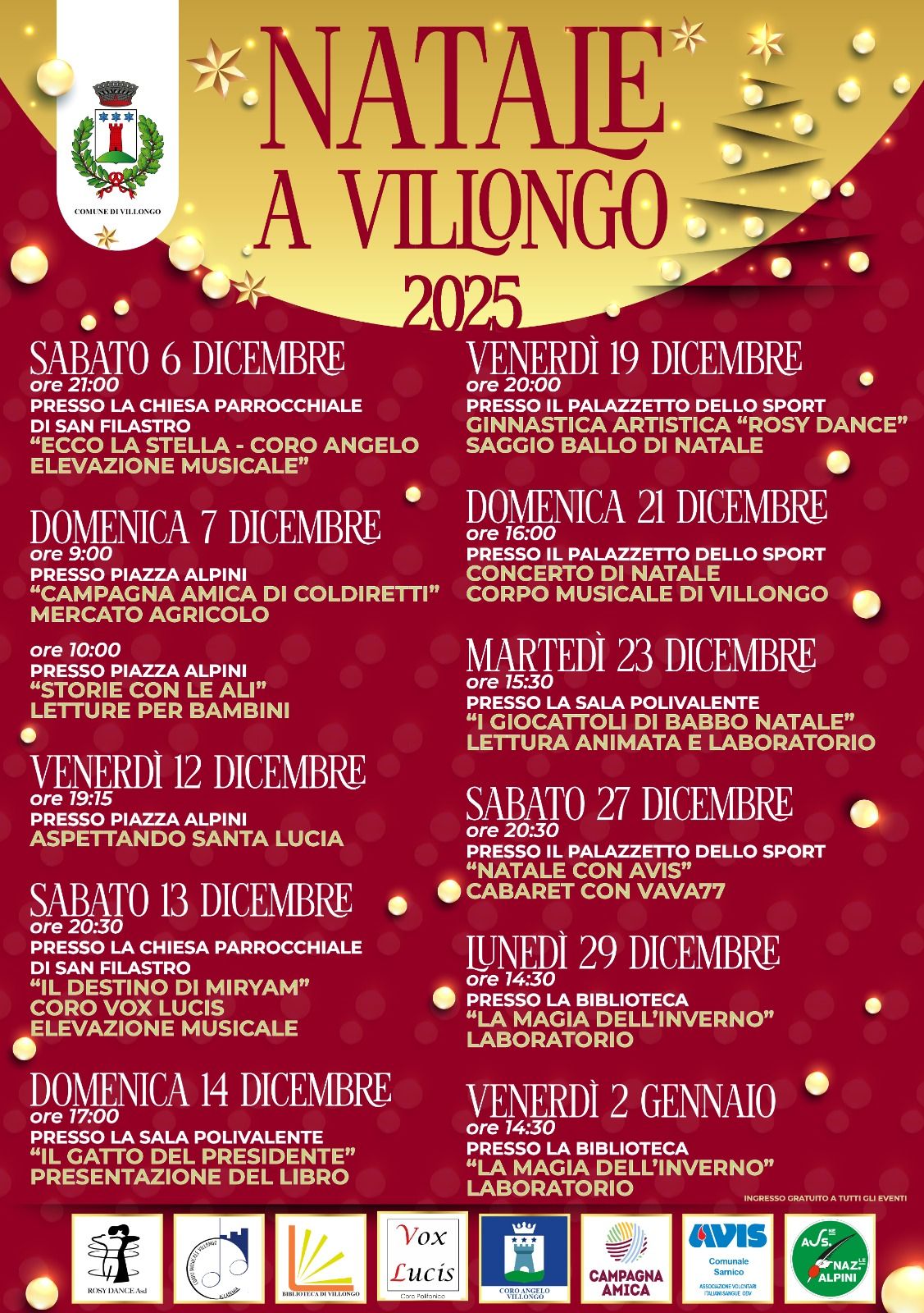 Domenica 21 dicembre, alle ore 16:00, presso il Palazzetto dello Sport di Villongo, si terrà il “Concerto di Natale” con il Corpo Musicale di Villongo.