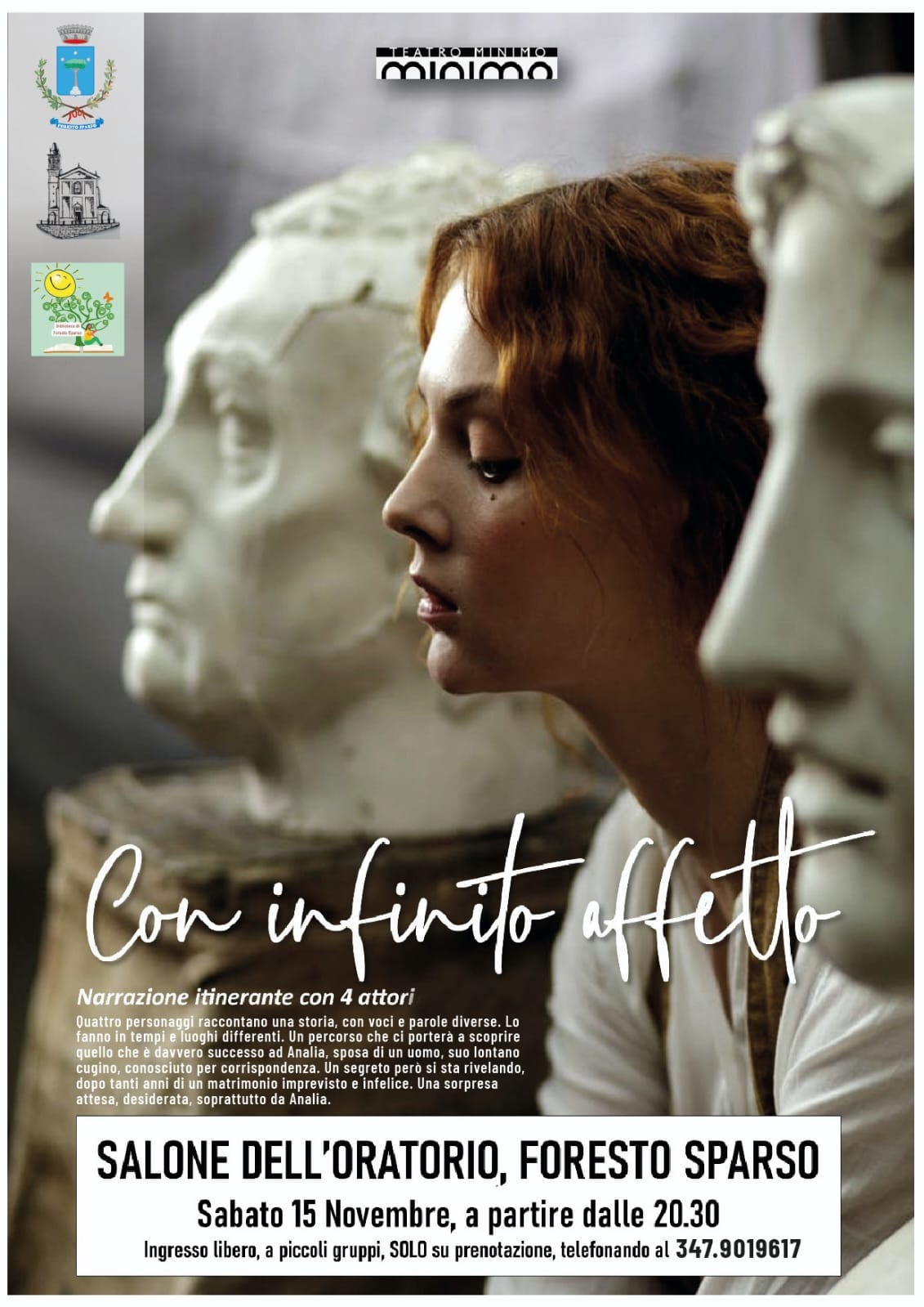 Sabato 15 novembre, a partire dalle ore 20:30, presso il salone dell’Oratorio di Foresto Sparso, si terrà l’incontro “Con infinito affetto”, una narrazione itinerante con quattro attori che condurrà il pubblico attraverso i sentimenti e i segreti di una vita.