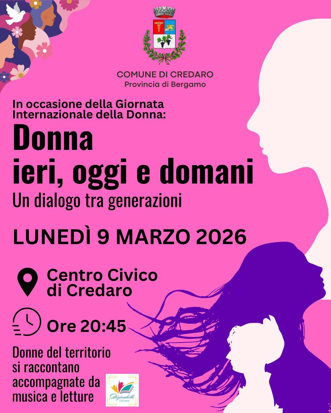 In occasione della Giornata Internazionale della Donna, lunedì 9 marzo, alle ore 20:45, presso il Centro Civico di Credaro, si terrà l’incontro “Donna ieri, oggi e domani. Un dialogo tra generazioni” in cui donne del territorio si raccontano accompagnate da musica e letture.