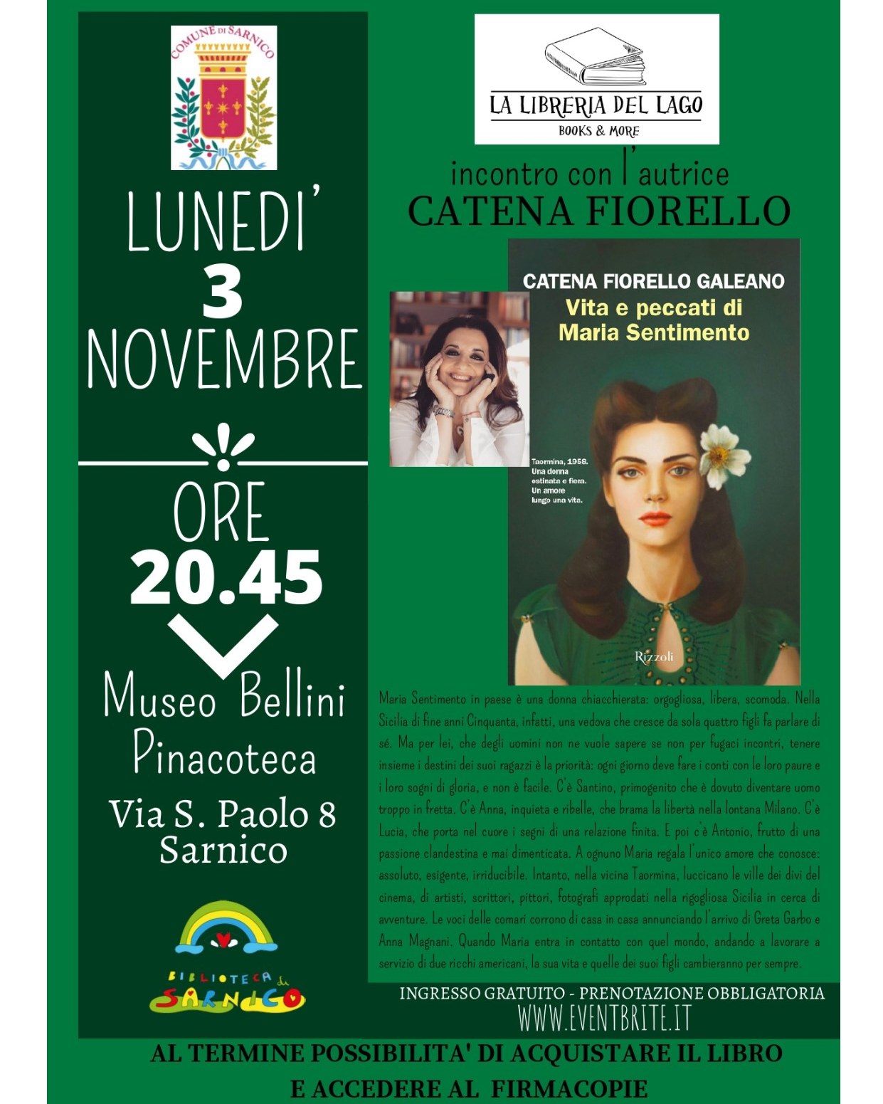 Lunedì 3 novembre, alle ore 20:45, presso la Pinacoteca Gianni Bellini di Sarnico, si terrà l’incontro con l’autrice Catena Fiorello, che presenta il suo nuovo romanzo “Vita e peccati di Maria Sentimento”.