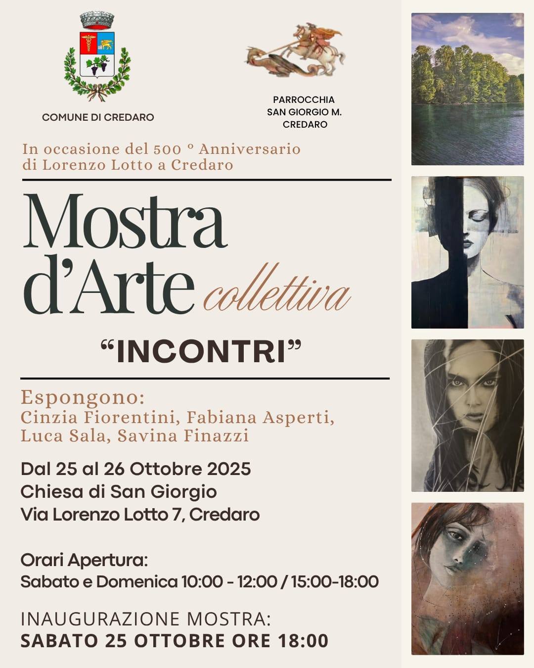 In occasione del 500° anniversario della presenza di Lorenzo Lotto a Credaro, sabato 25 e domenica 26 ottobre, si terrà la Mostra d’Arte collettiva “INCONTRI”, presso la Chiesa di San Giorgio a Credaro.