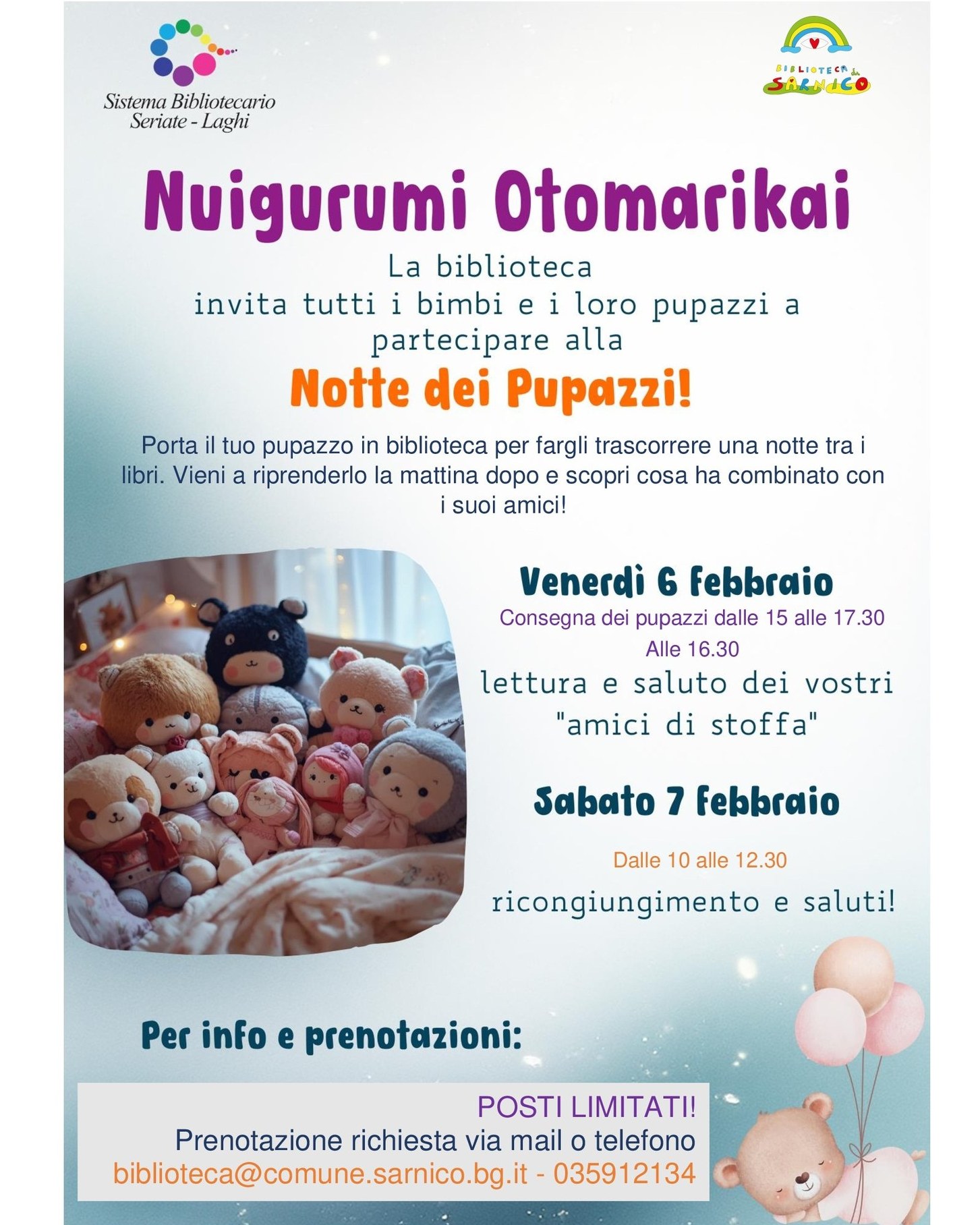 Venerdì 6 febbraio, presso la Biblioteca di Sarnico, si terrà la “Notte dei Pupazzi” – Nuigurumi Otomarikau.