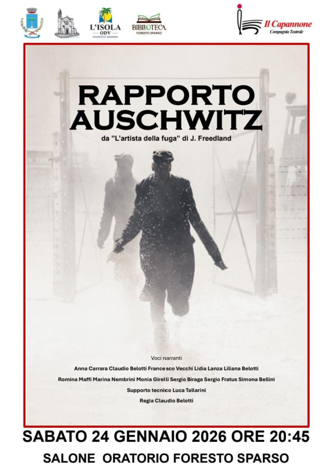 Sabato 24 gennaio, alle ore 20:45, si terrà presso il salone dell’Oratorio di Foresto Sparso, lo spettacolo “Rapporto Auschwitz” da “L’artista della fuga” di J. Freedland.