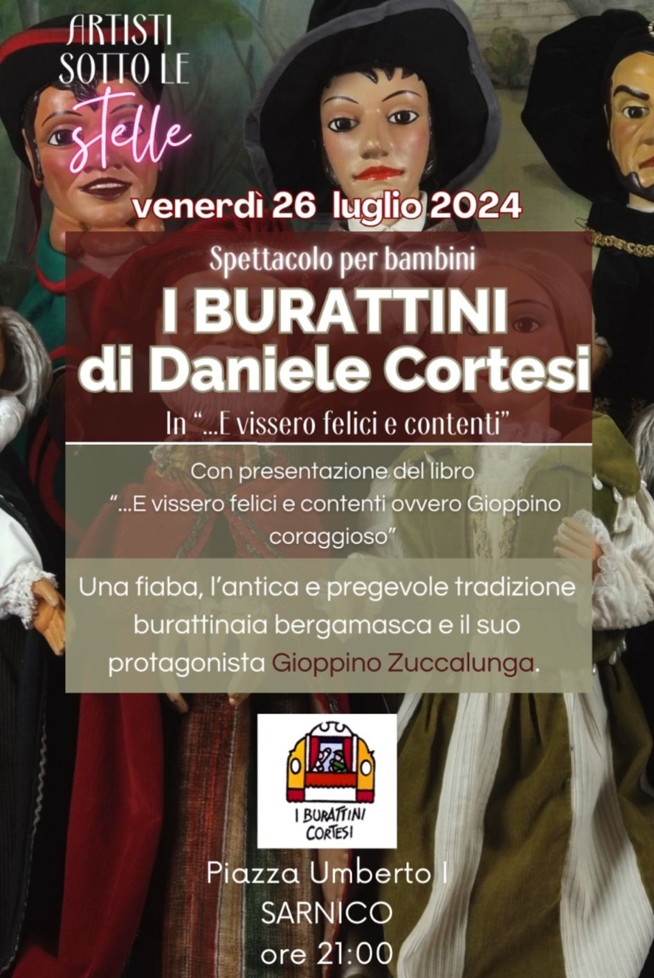 On the occasion of the “Artisti Sotto le Stelle” event, on Friday 26th July, at 9.00 pm, in Piazza Umberto I in Sarnico, the Puppet Show “And they lived happily ever after” by Daniele Cortesi will be held.
