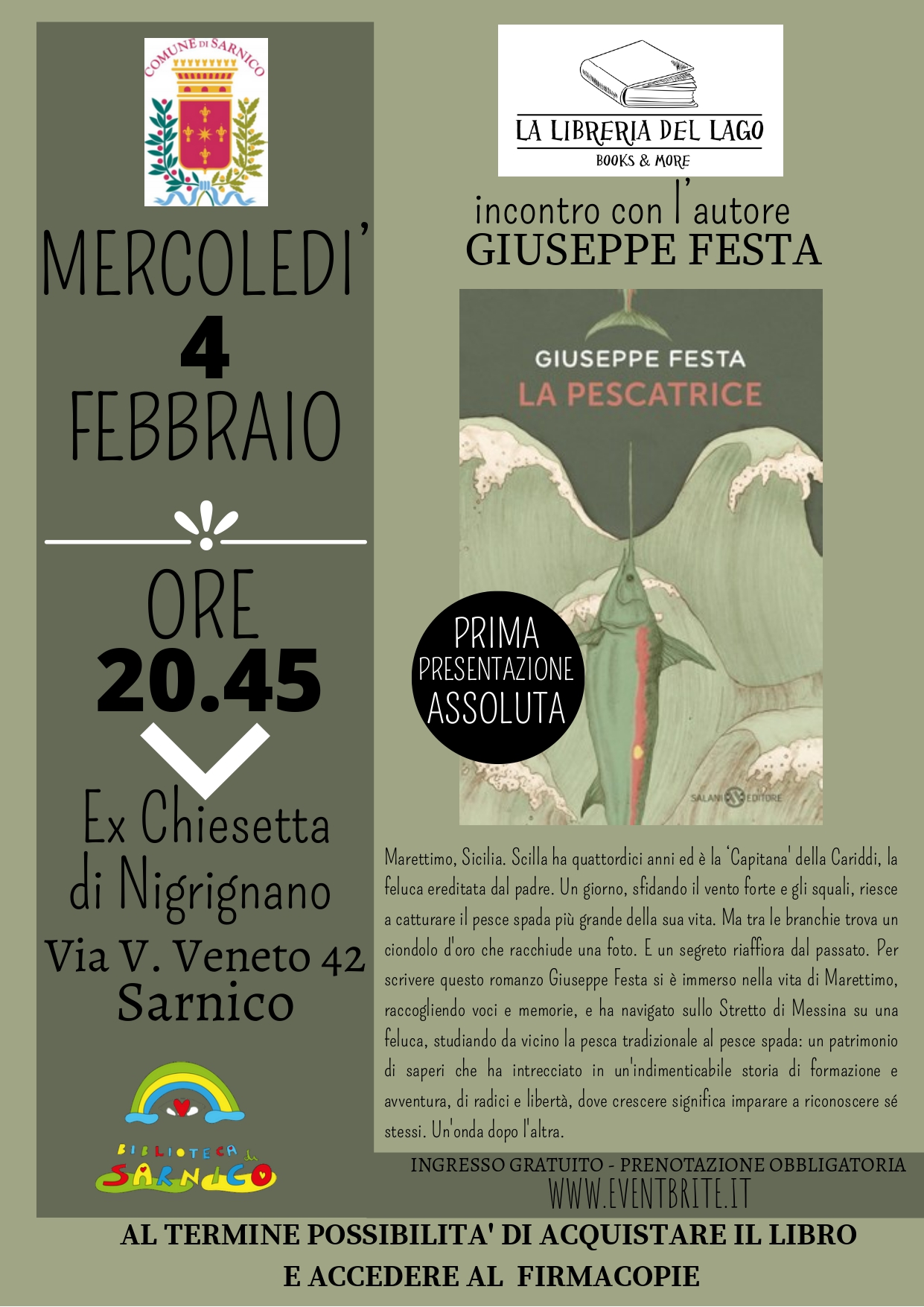 On Wednesday, February 4th, at 8:45 pm, author Giuseppe Festa will present a preview of his new novel “La pescatrice” at the former church in Nigrignano di Sarnico.