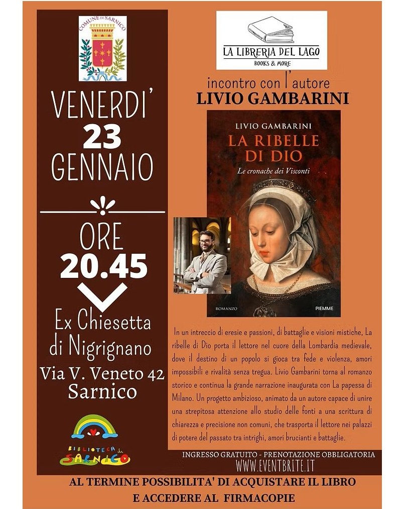 On Friday, January 23rd, at 8:45 pm, at the Ex Chiesetta di Nigrignano in Sarnico, author Livio Gambarini will present his novel “La ribelle di Dio. Le cronache dei Visconti” (Piemme), a work that marks the author’s return to historical fiction after the success of La papessa di Milano.