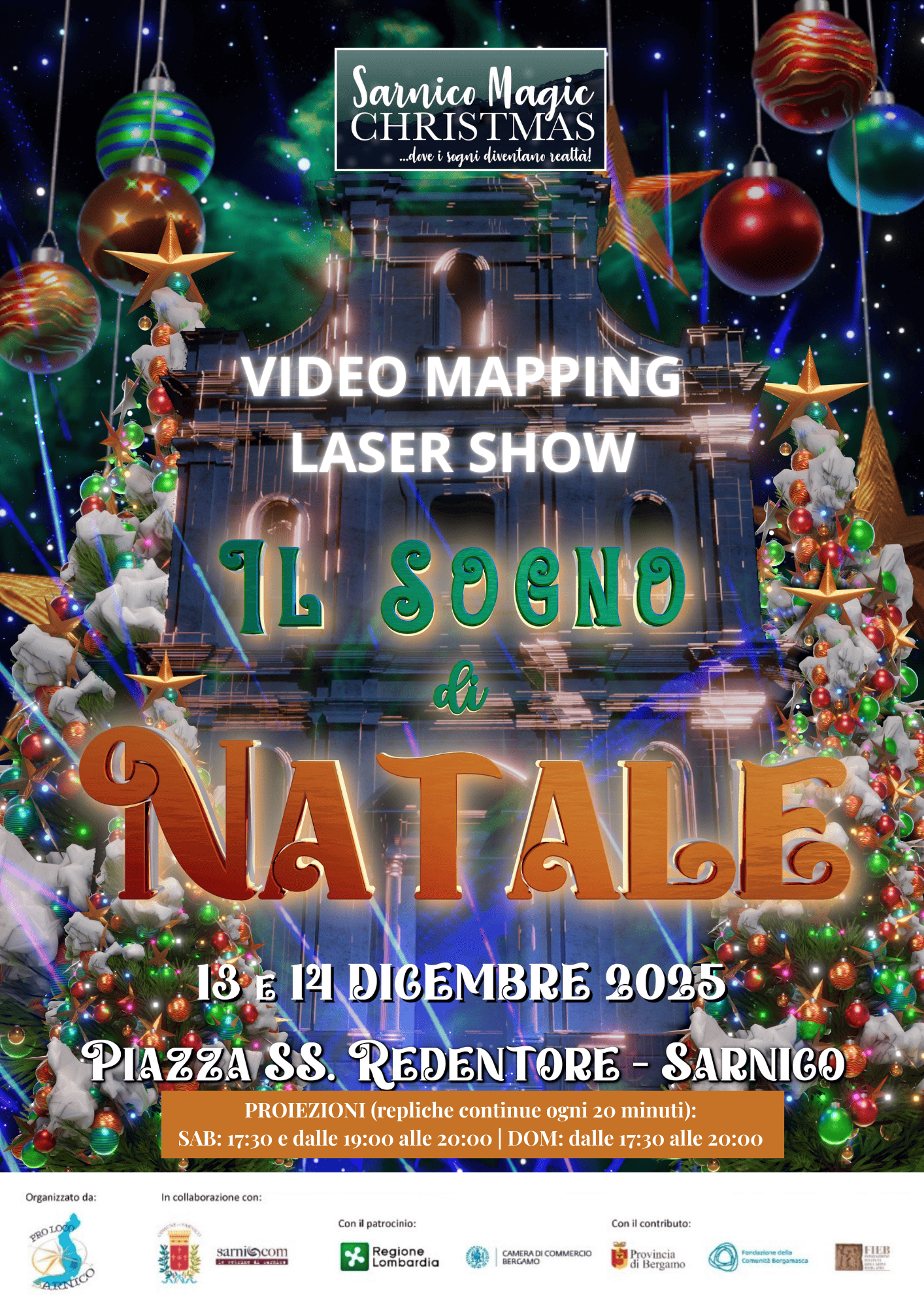 On the occasion of “Sarnico Magic Christmas…where Dreams Come True,” on Saturday, December 13th and Sunday, December 14th, it will be possible to admire the Video Mapping/Laser Show “The Christmas Dream”, which will animate the façade of the Parish Church in Piazza SS. Redentore in Sarnico.